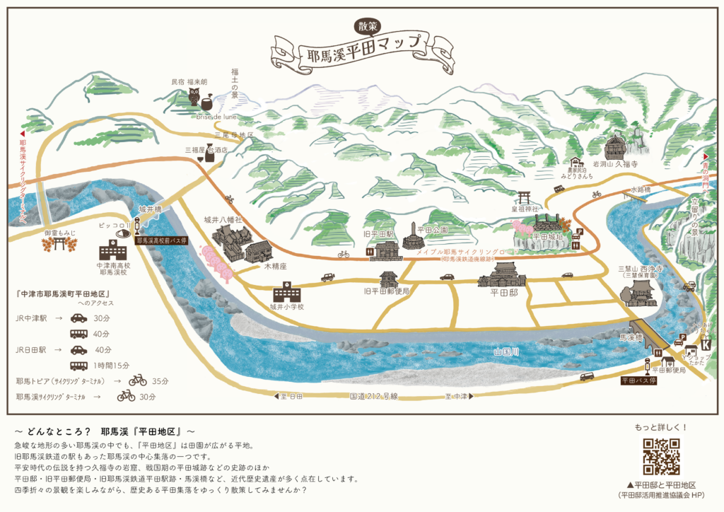急峻な地形の多い耶馬渓の中にあって、平田集落は田園が広がる平地で、旧耶馬渓鉄道の駅もあった耶馬渓の中心集落の一つです。